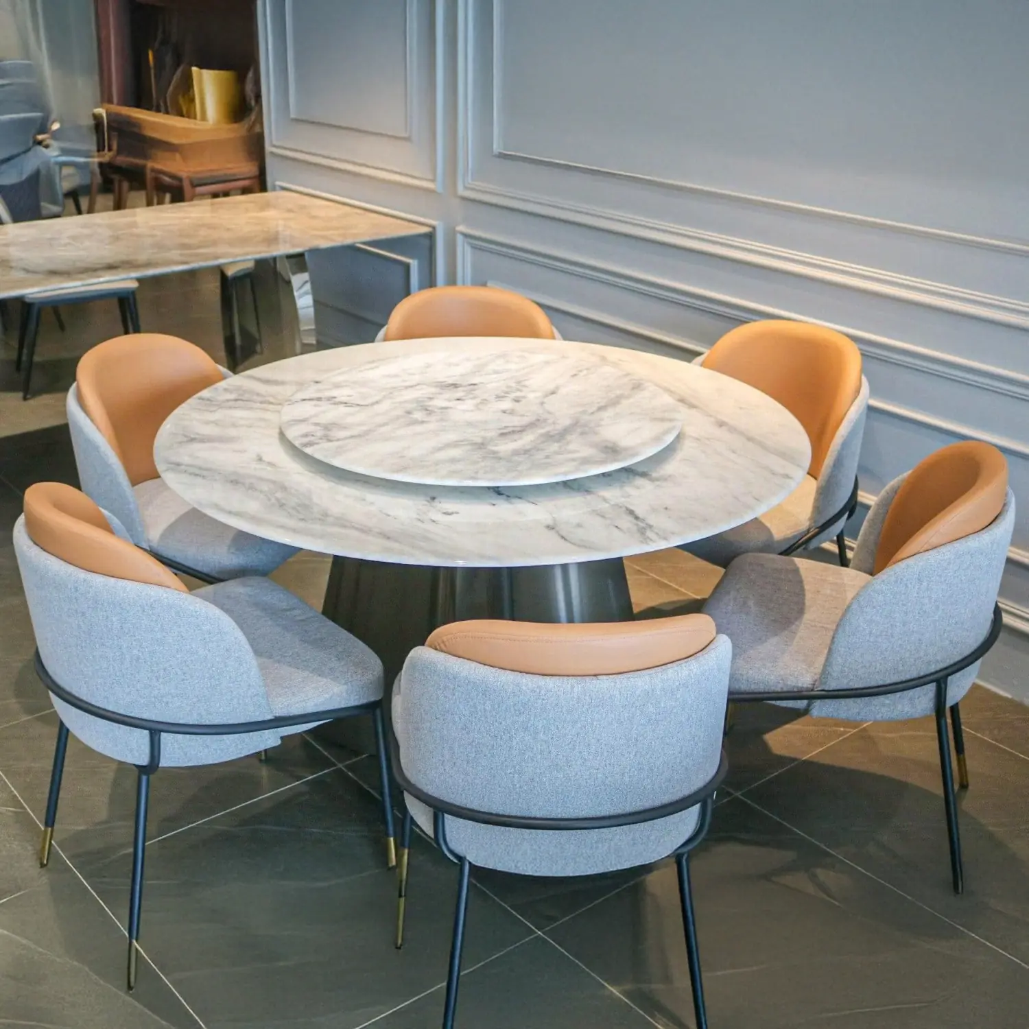 - Bàn tròn với mâm xoay giúp dễ dàng chia sẻ thức ăn, tạo nên sự gắn kết trong mỗi bữa ăn gia đình.