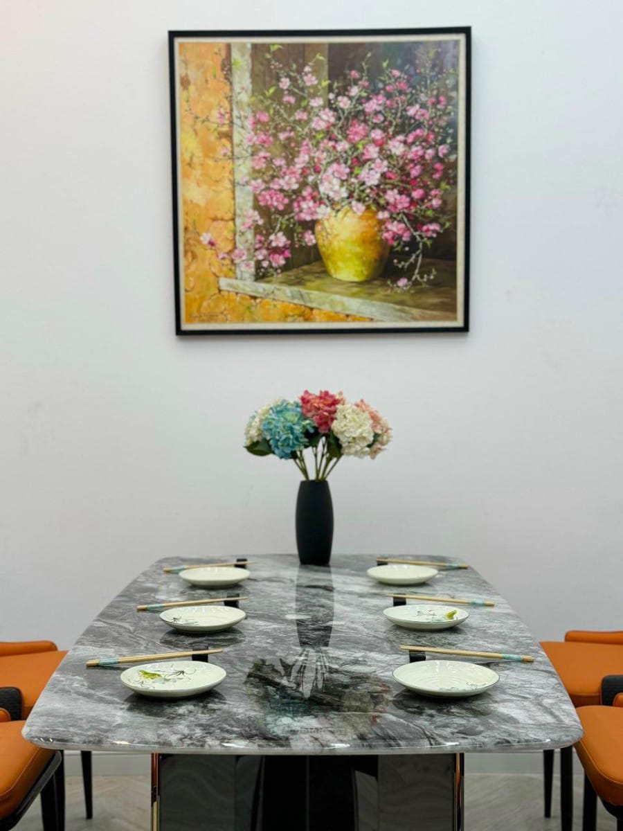 - Thiết Kế Tinh Tế: Sự kết hợp giữa mặt bàn đá và chân inox tạo nên tổng thể hài hòa, sang trọng.